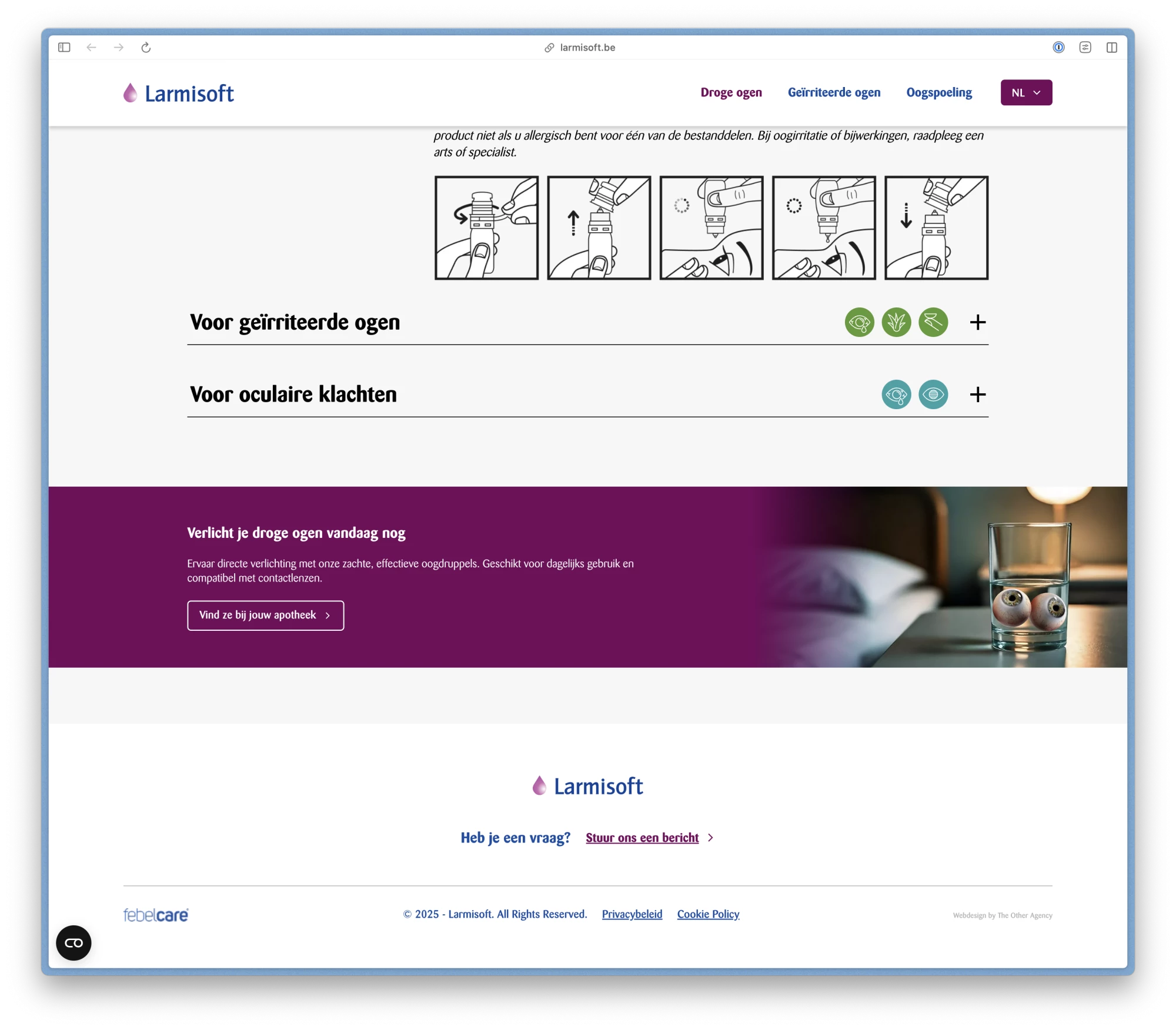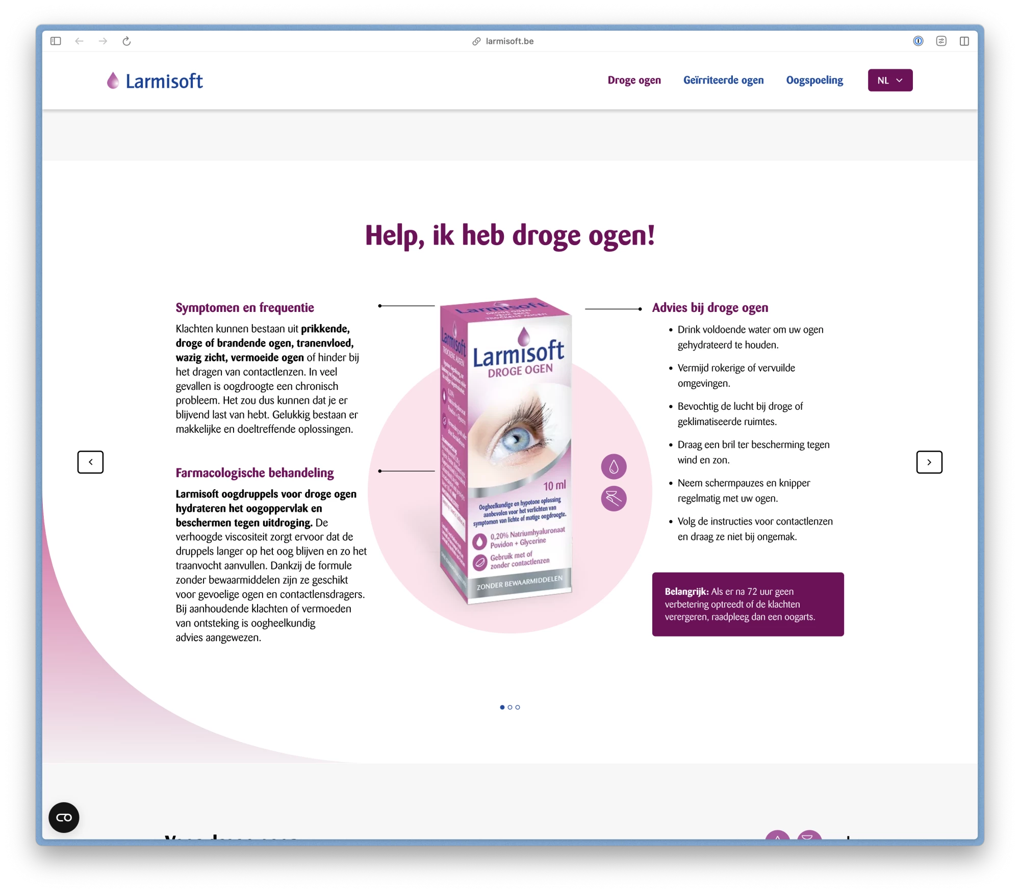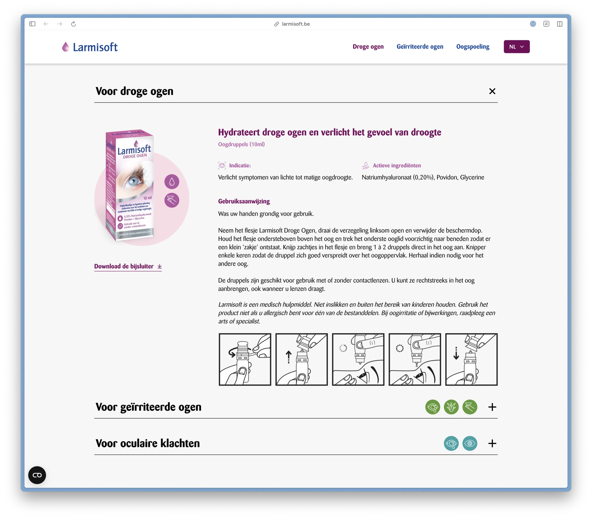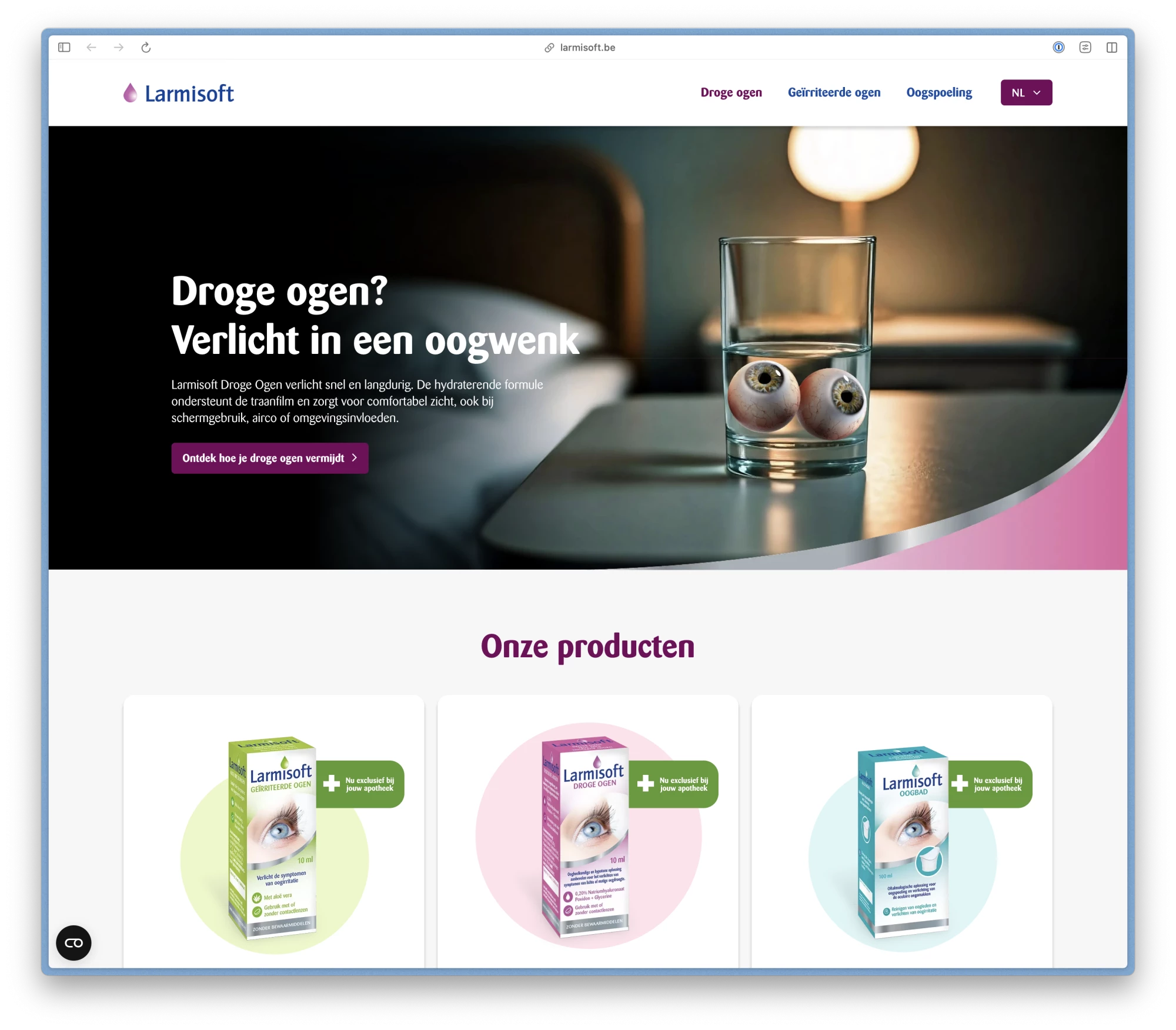 Deze landingspagina bouwde ik mee voor Larmisoft, een merk dat je helpt om droge ogen vermijden. En ja – ik heb dat intussen al duizend keer hardop gezegd met een radiostem.