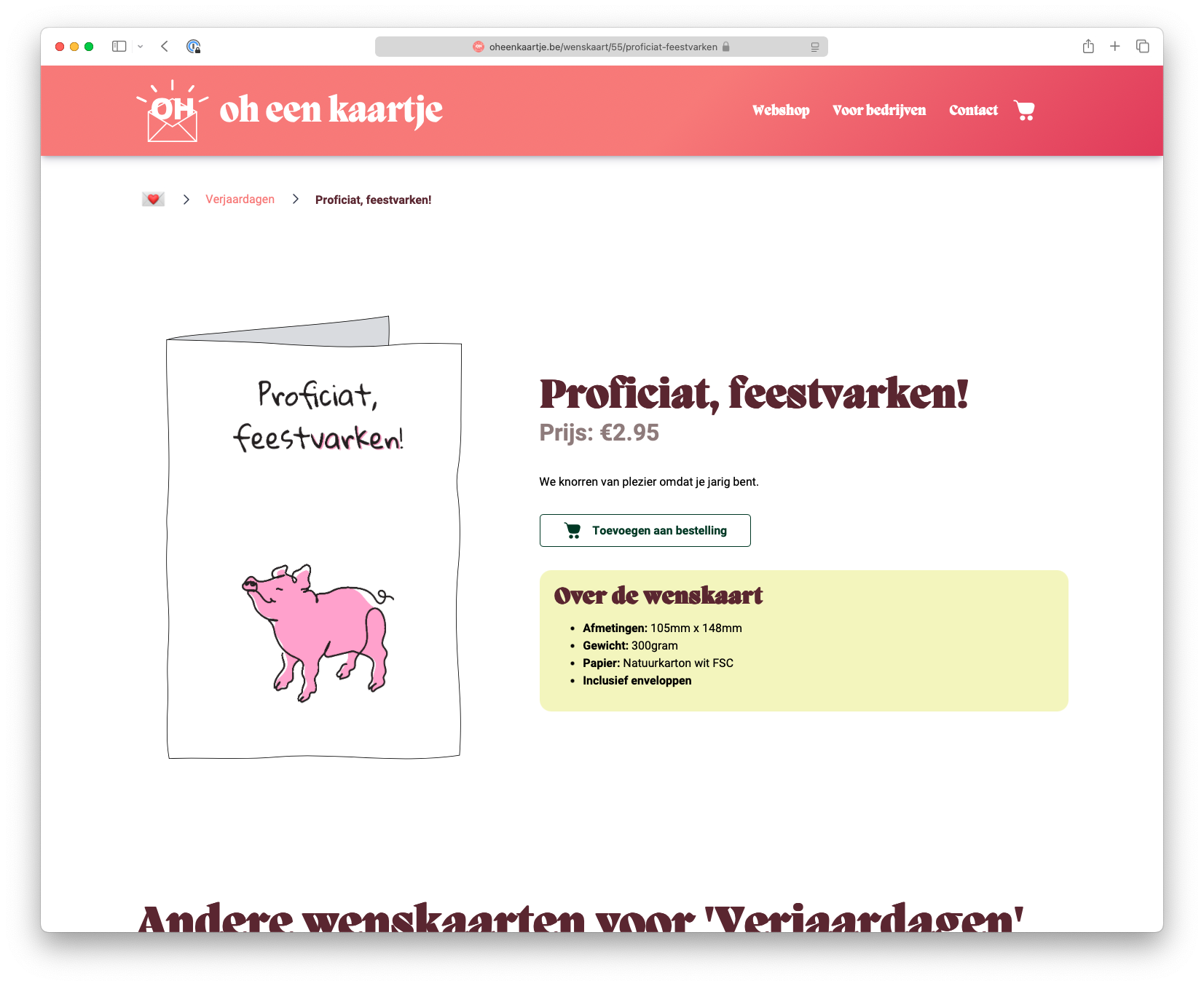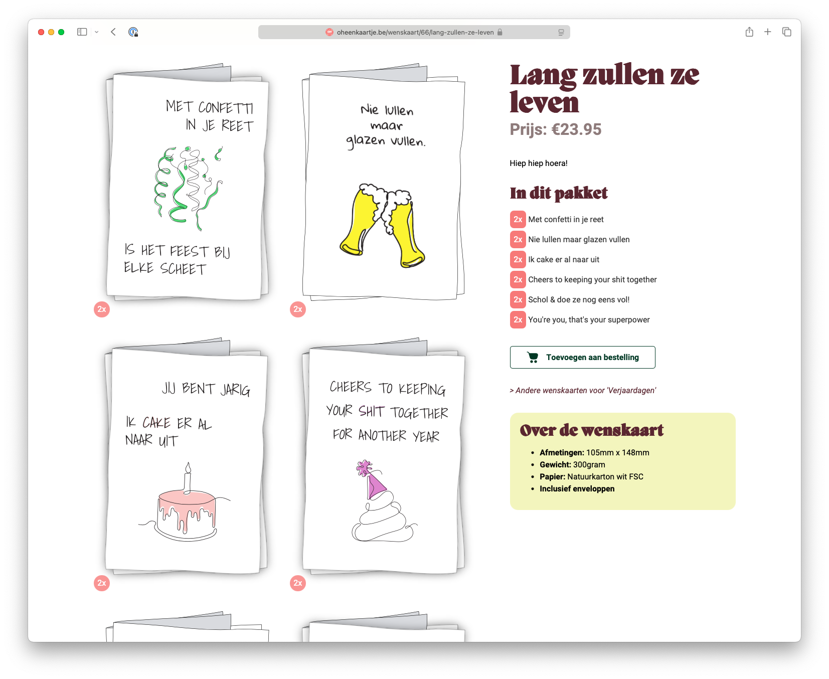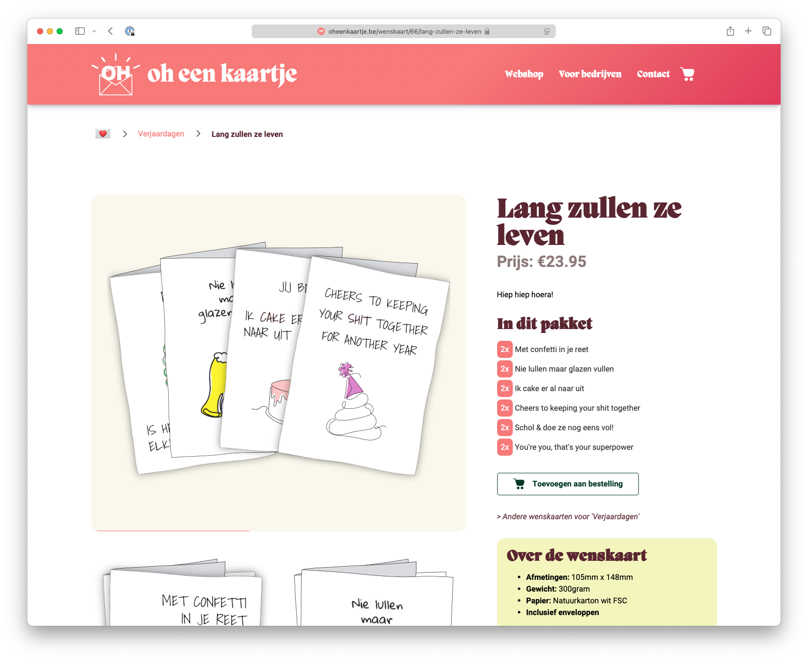 "Oh een kaartje" is een Belgische webshop die een breed assortiment wenskaarten aanbiedt voor diverse gelegenheden, zoals verjaardagen, huwelijken, geboortes en feestdagen. De kaarten zijn ontworpen met een unieke en humoristische stijl gedrukt op kwaliteitsvol papier, waardoor ze zich onderscheiden van standaard wenskaarten.