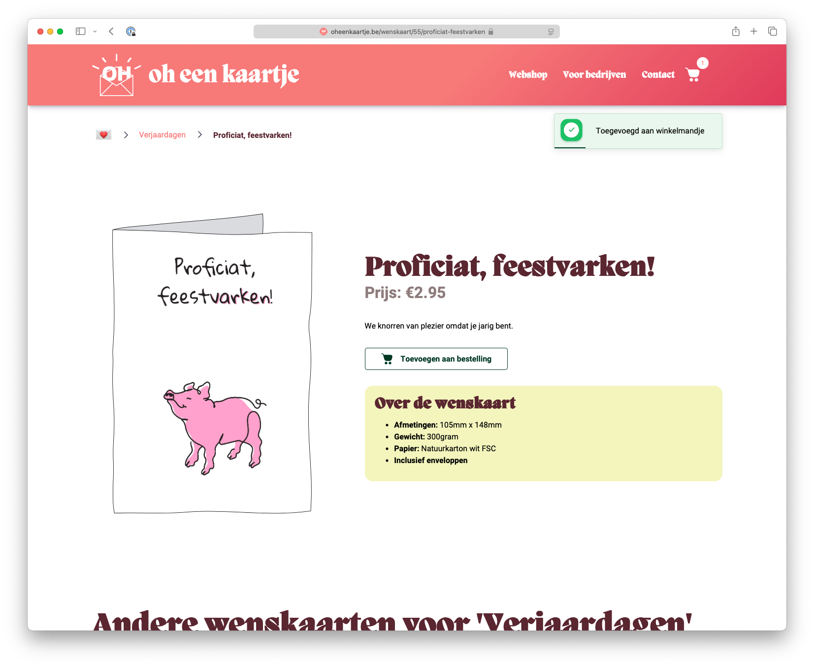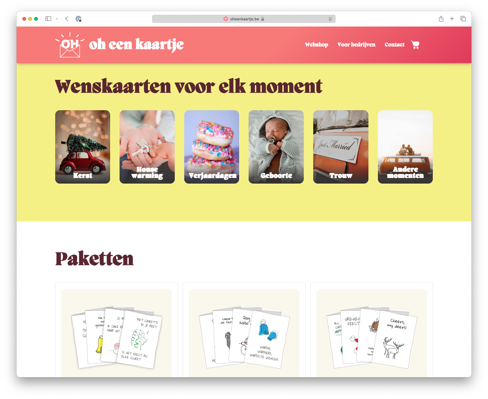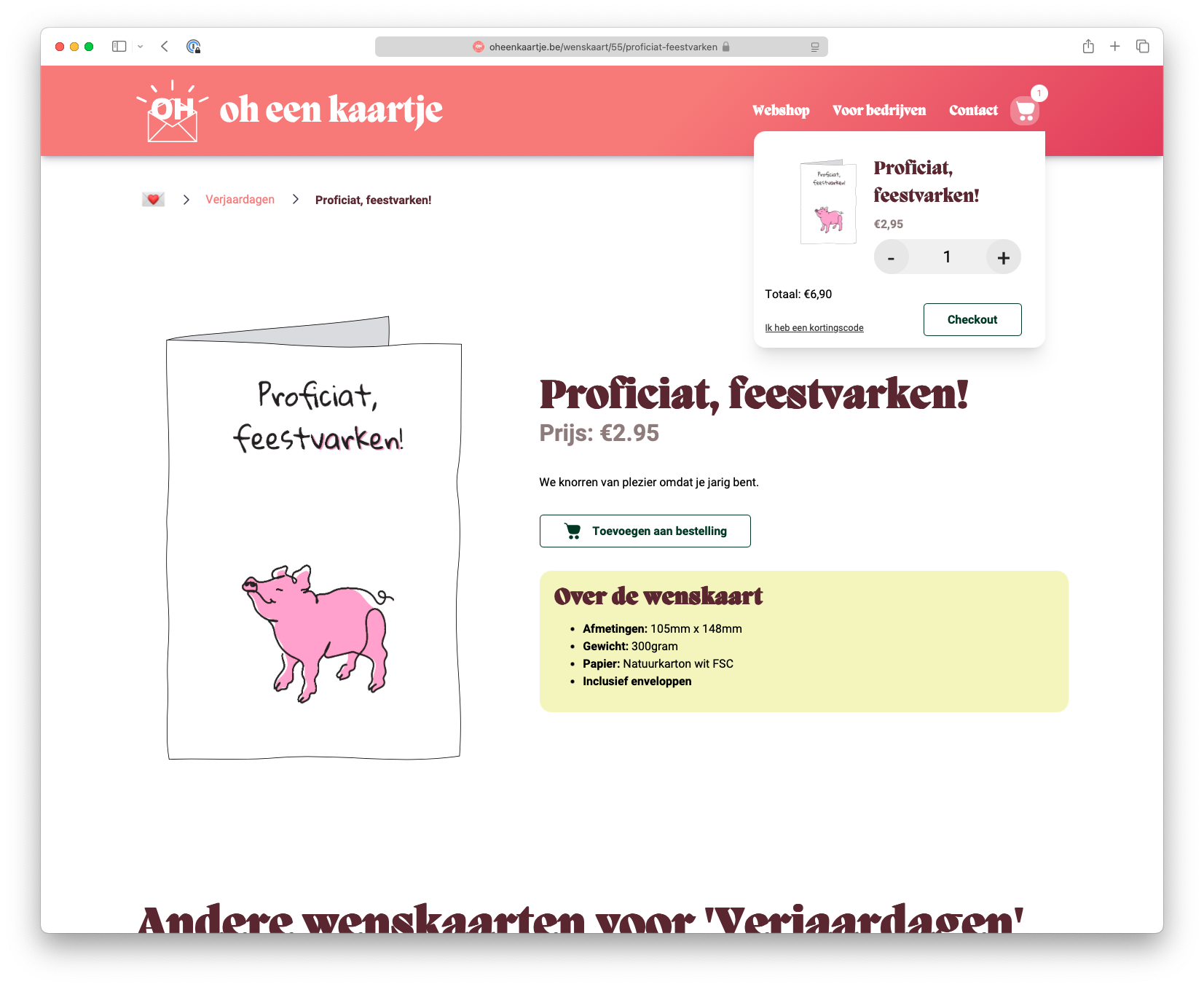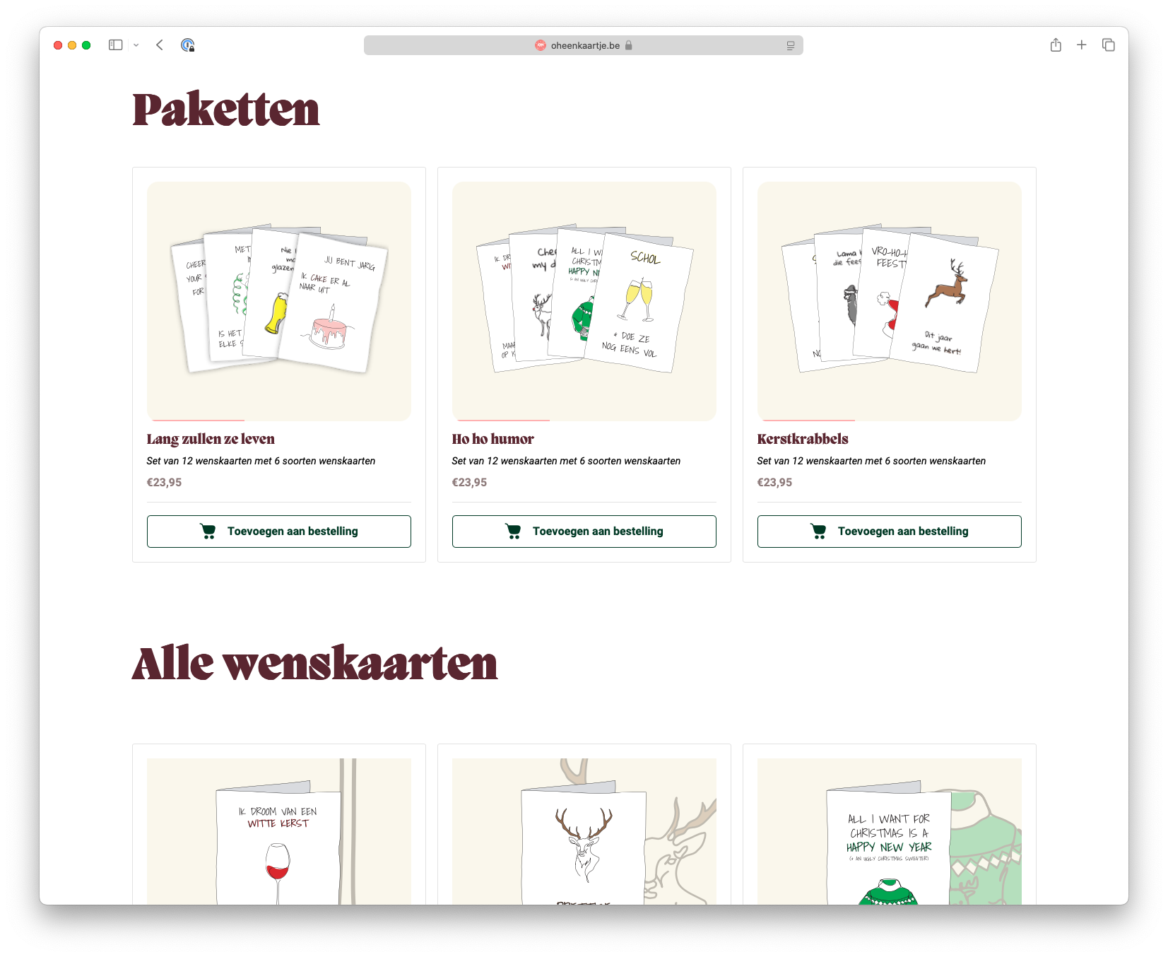 "Oh een kaartje" is een Belgische webshop die een breed assortiment wenskaarten aanbiedt voor diverse gelegenheden, zoals verjaardagen, huwelijken, geboortes en feestdagen. De kaarten zijn ontworpen met een unieke en humoristische stijl gedrukt op kwaliteitsvol papier, waardoor ze zich onderscheiden van standaard wenskaarten.